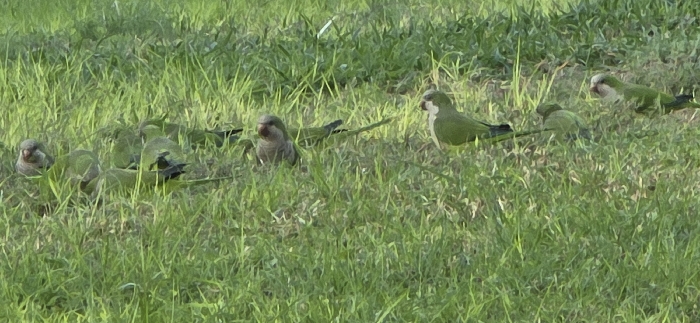 - "A group of approximately ten to twelve green Monk Parakeets (Myiopsitta monachus) is depicted on a patch of green grass in Hod HaSharon, Israel" by FM-54Y1t1, licensed under CC BY 4.0