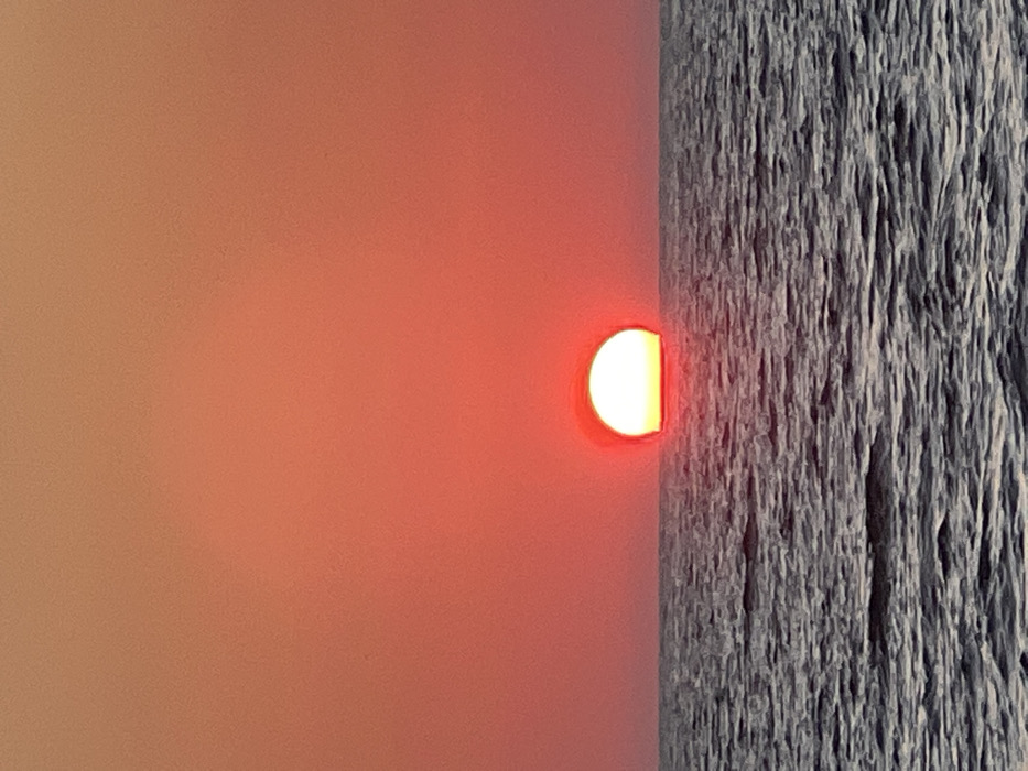 A half-circle light glows warmly on an adjacent gray, rough textured wall. The wall is vertically aligned with the light. The left half of the light is bright white, while the right is tinted orange and red. The light casts a soft red hue onto the tan colored wall to the left. The textures on the gray wall have vertical ridges and valleys.