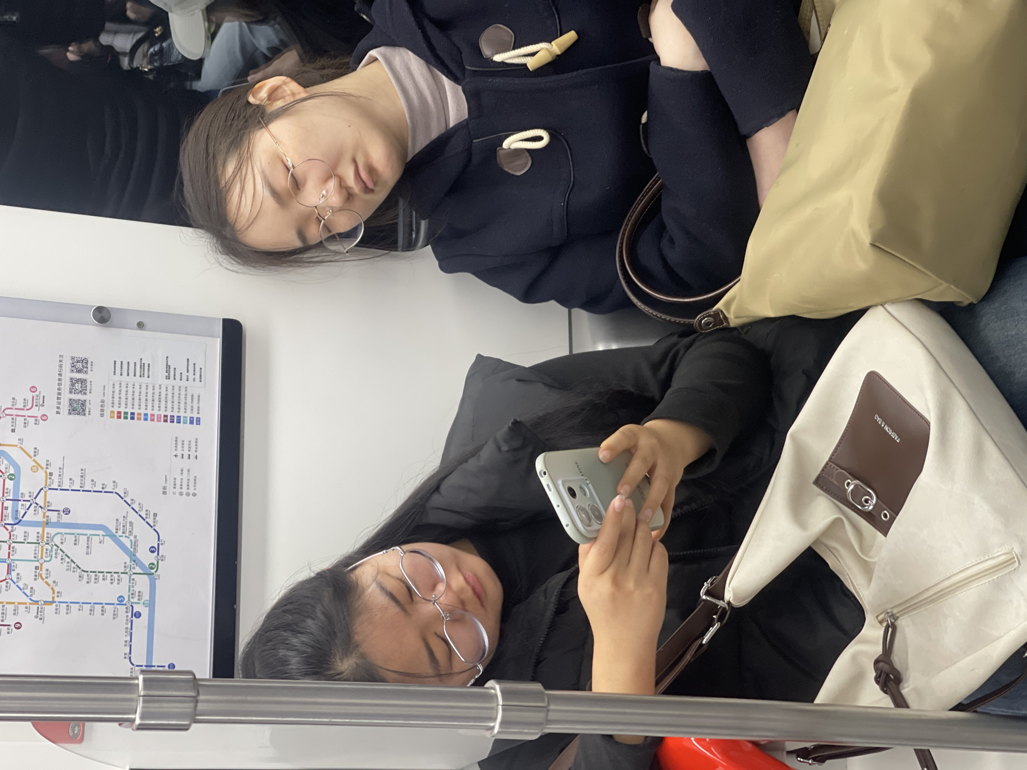 The scene depicts the interior of a Chongqing subway train, confirmed by a visible subway map on the wall displaying routes and stations within Jiulongpo District, China. Two East Asian females are seated side-by-side. The individual on the left wears clear-rimmed glasses, a black puffer jacket, and holds a light green smartphone with both hands, viewing the screen. A cream-colored shoulder bag with brown accents rests on her lap. Adjacent to her, the second individual, wearing gold-rimmed glasses, a light pink turtleneck, and a navy duffle coat with wooden toggle closures, has her eyes closed and arms crossed, indicating sleep or rest. A light beige shoulder bag is positioned beside her. A silver vertical support pole is visible in the foreground, separating the individuals from the left side of the frame.