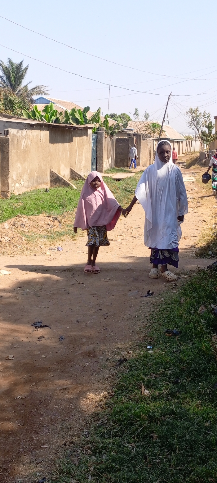 This image depicts a sunlit dirt road in Ungwan Liman, Nigeria, flanked by single-story residential structures. In the foreground, two females walk hand-in-hand. The younger individual, on the left, wears a pink hijab, a multi-colored patterned skirt, and pink slip-on sandals; her mouth is slightly open, and she looks towards the viewer's left. The older individual, on the right, wears a white flowing garment over a dark patterned skirt and light-colored slip-on shoes; she looks slightly to the viewer's right. Both cast long shadows on the dusty ground. The dirt path is bordered by green grass and scattered debris. In the mid-ground, a male figure in a light shirt and blue trousers walks away on the left side of the path. Further in the background, a partially visible female figure walks away on the right, appearing to carry an item on her head. The surrounding environment includes buildings constructed from concrete or mud-brick with corrugated metal roofs. Vegetation, including a palm tree on the far left and large-leafed plants (possibly banana or plantain) near structures, is visible. Overhead electrical wires traverse the scene, supported by a wooden utility pole on the right. The sky is clear and light blue.