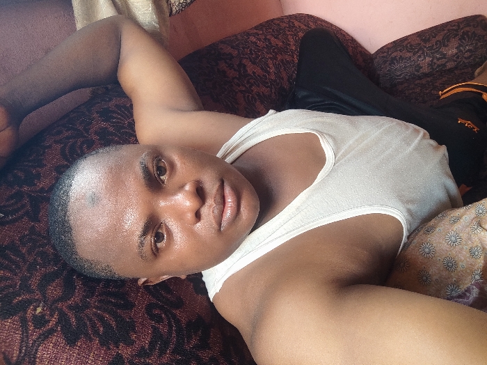 The scene depicts a male individual reclining on an upholstered sofa within an indoor setting in Akwanga, Nigeria. The subject, an adult male with dark skin and a short, dark haircut, is wearing a white sleeveless undershirt and dark athletic trousers with an orange stripe on the left leg. He is positioned at an angle, looking directly into the camera with a neutral facial expression; his skin exhibits a reflective sheen. The sofa is upholstered in a dark reddish-brown fabric featuring a patterned design. A light-colored cushion with a floral pattern is visible near his lower body. The background includes a plain pink wall and a partially visible light-colored curtain in the upper left.