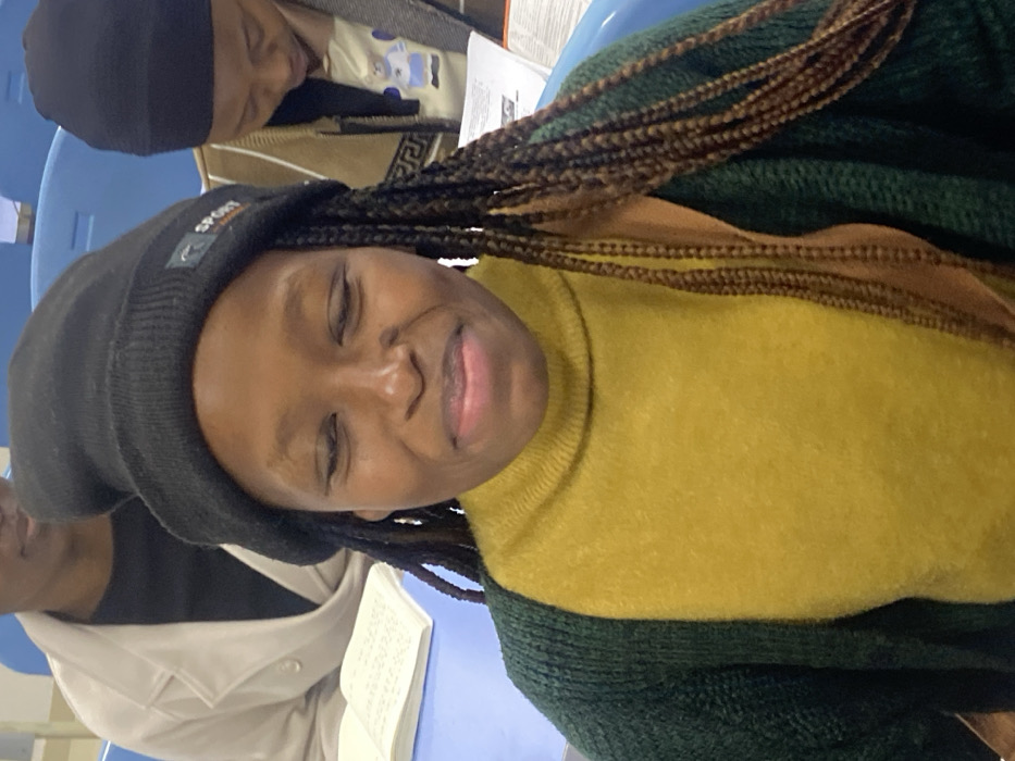 A woman with dark skin and braided hair wears a black beanie, a mustard yellow turtleneck, and a dark green cardigan. Her eyes are closed, and she's slightly smiling. She sits at a blue table with a white book on it. Another person with a black beanie sits to her left. In the background, another person wears a white jacket with a patterned sweater.