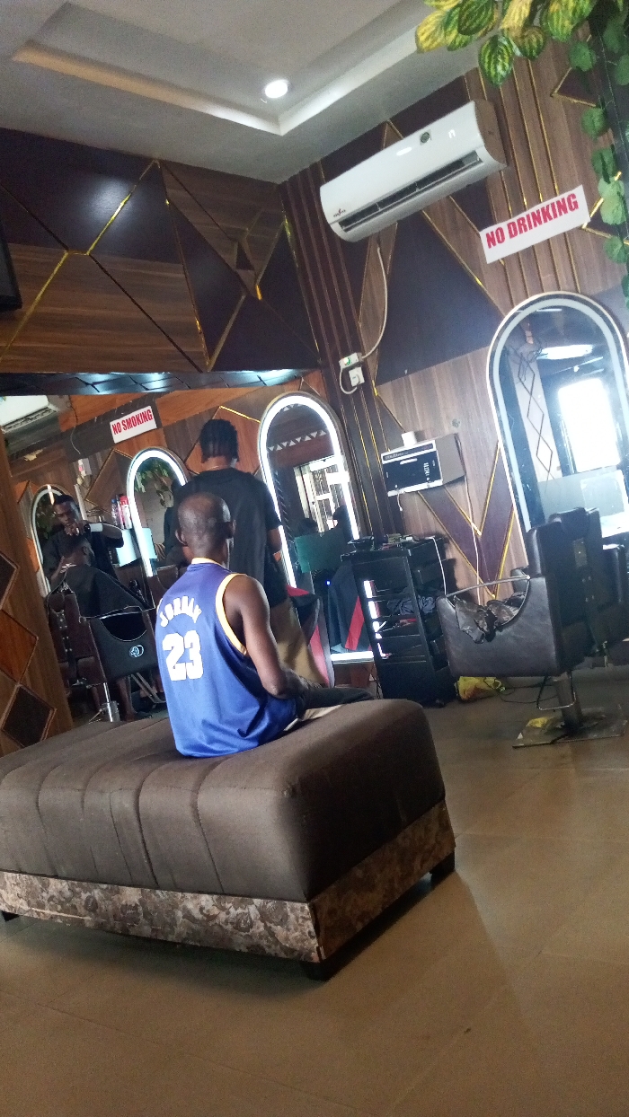 The image depicts the interior of a hair salon or barbershop in an unknown city and country