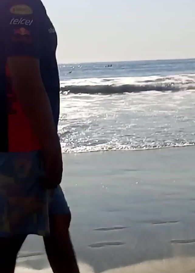 sunny beach scene. There are several people in the water, including adults and children. Some are standing, while others are wading or swimming. One person is carrying a colorful boogie board. In the background, boats can be seen on the water, and a tall building is visible along the coastline. In the foreground, the sandy beach is wet from the receding waves, reflecting the light. Several people are walking along the beach.