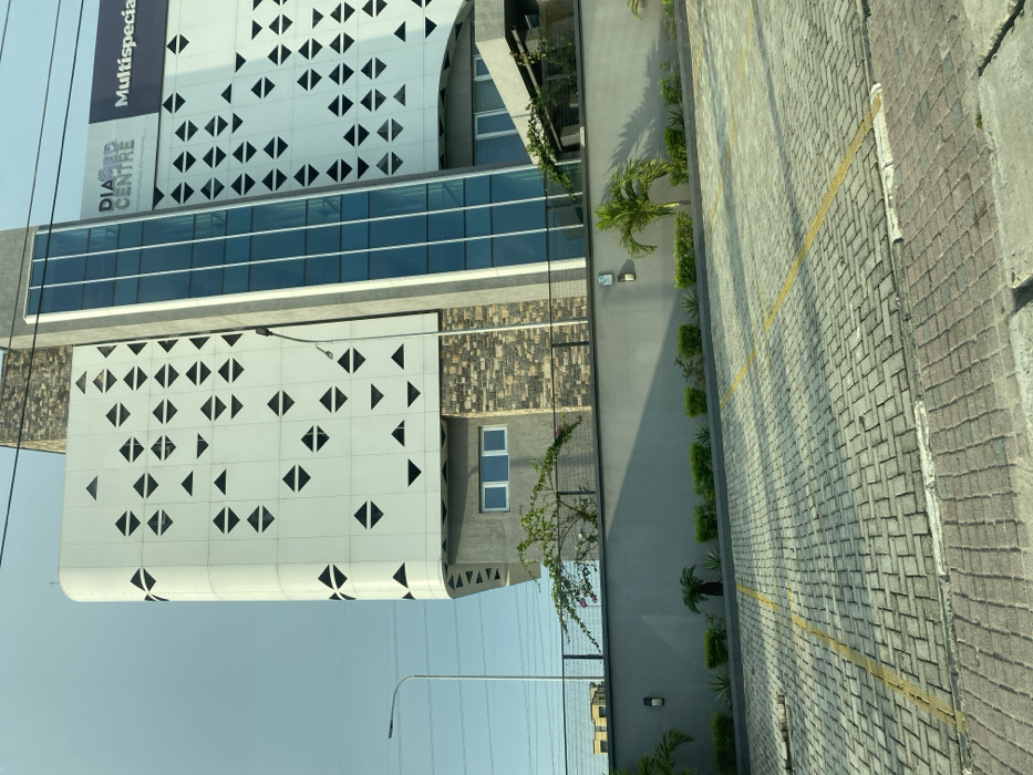 The image displays the exterior of a modern multi-story commercial building, identified by prominent signage as the "DIAMED CENTRE Multispecialty," located in Ilado, Nigeria