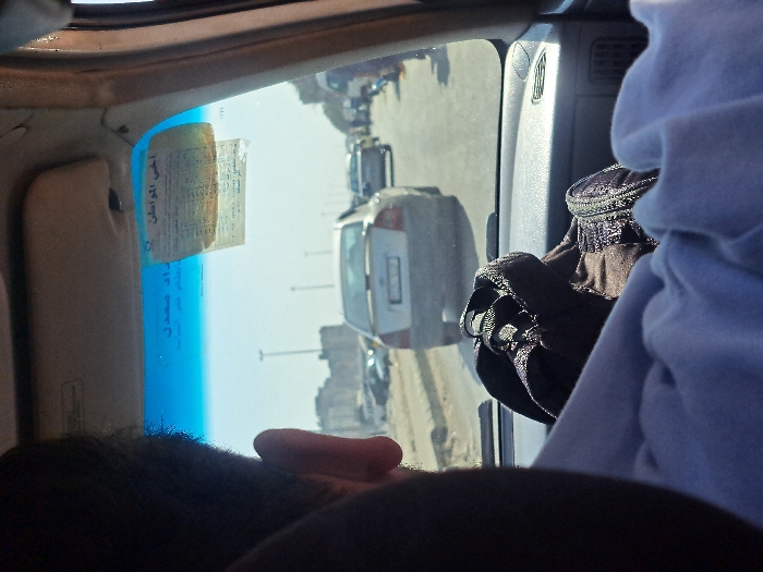 The image depicts a forward-facing view from inside a vehicle, capturing a street scene in the city of Unknown, Unknown. The back of a dark-haired individual's head and right ear are visible on the left side of the frame. A light-toned garment drapes over a dark grey dashboard. A black, bundled textile object rests centrally on the dashboard. The vehicle's windshield features a blue tint strip at the top and a beige sun visor is in the raised position. Two faded paper documents, displaying Arabic text including "أخي المواطن", are affixed to the windshield near the sun visor. Ahead, a light-colored sedan is positioned on a paved multi-lane road, its rear license plate visible as white with black characters. Additional vehicles are present further down the road, some in traffic, others parked on a sandy or dirt shoulder to the left. The background shows indistinct, light-colored urban buildings and utility poles against a clear, bright blue sky, indicating daytime conditions.