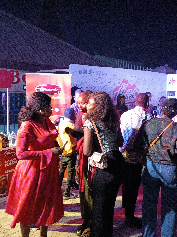 At an outdoor event, a woman in a vibrant red dress stands engaged in conversation with two other women. They are positioned near event booths adorned with signage. Other people mingle in the background, some facing away from the camera, suggesting a bustling atmosphere. A large white wall marked with signatures serves as a backdrop for the crowd. The overall scene suggests a promotional event or gathering.