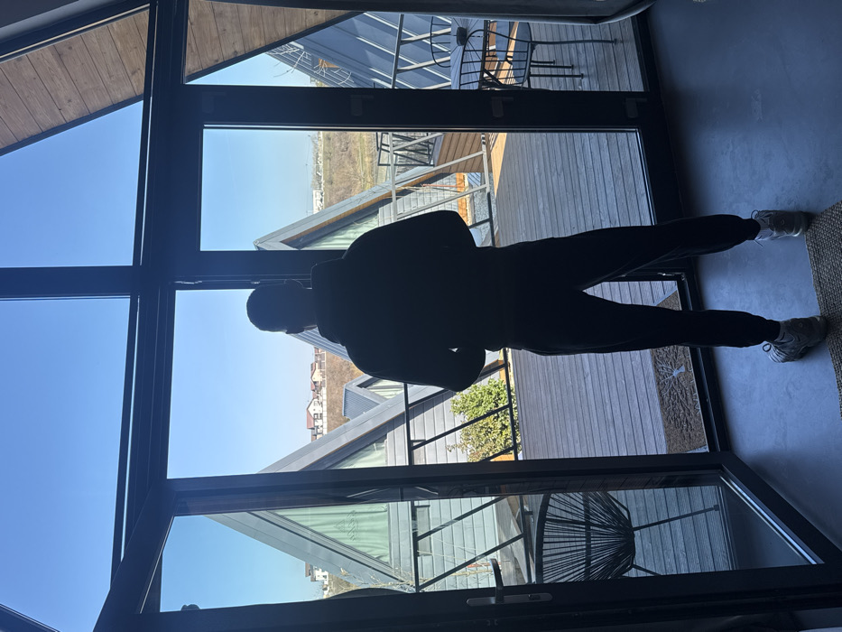 The image depicts a silhouetted individual, identified as male, standing with their back to the viewer, gazing outwards through large, black-framed glass doors and windows in Căciulați, Romania. The individual wears a dark hooded sweatshirt, dark pants, and light-colored sneakers, standing on a dark interior floor with a small patterned doormat nearby. The glass doors are partially open, leading to an outdoor wooden deck featuring a black wire-frame chair to the left and a small black metal table with two matching chairs to the right; a light-colored object rests on the table. Beyond the deck, multiple modern, triangular-shaped buildings with dark roofs and large glass facades are visible under a clear blue sky. Sparse vegetation, possibly bare trees or bushes, is present between the buildings. In the distant background, residential houses are situated on a low ridge. The scene is illuminated by bright daylight.
