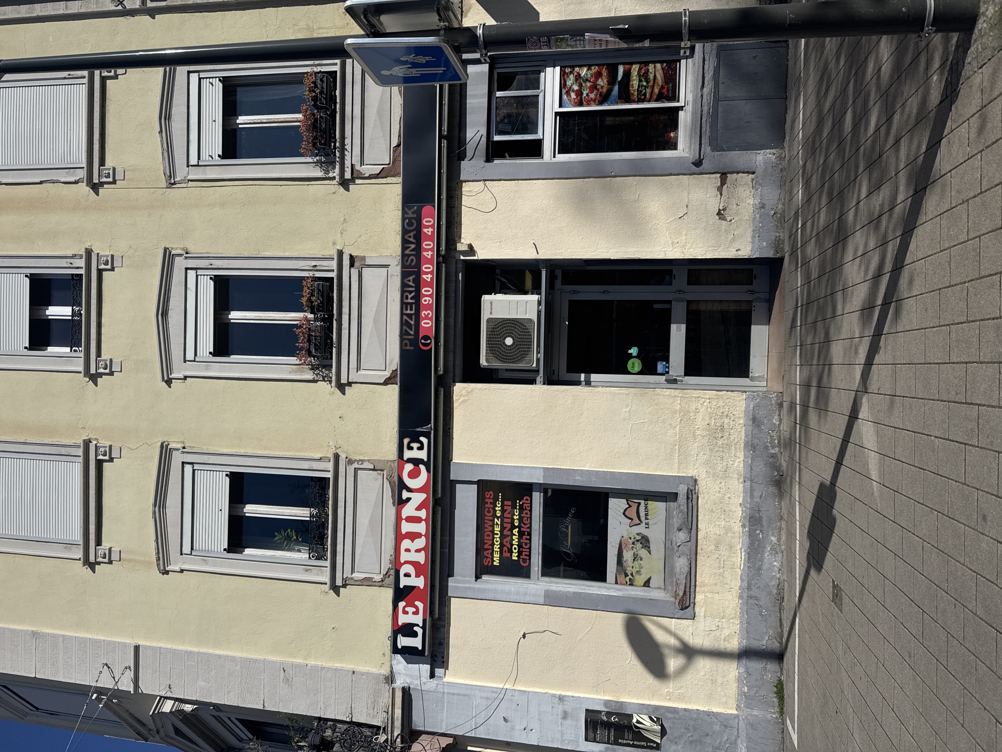 A ground-level, eye-level perspective captures the facade of "LE PRINCE Pizzeria Snack" at Place Sainte-Aurélie, France, on a clear, sunny day. The establishment occupies the ground floor of a three-story building with a pale yellow stucco exterior, exhibiting cracks and peeling paint, particularly at the base. The upper two floors feature multiple windows, each equipped with closed white roller shutters and ornate decorative surrounds. The first-floor windows also include black metal window boxes containing desiccated foliage. The "LE PRINCE" sign, in red and white lettering, spans the storefront, displaying "PIZZERIA SNACK" and a French telephone number "03 90 40 40 40". To the left of the central glass entrance door, a display window features a red sign listing "SANDWICHS MERGUEZ etc... PANINI ROMA etc... Chich-Kebab", with a lower section displaying a promotional image of a burger and the "LE PRINCE" crown logo. The window's lower frame is significantly deteriorated. An air conditioning unit, branded "Brandt," is mounted above the central glass door, which also bears an "Uber Eats" sticker. The right display window showcases large promotional images of pizza and another sandwich item. The foreground consists of a gray paver sidewalk with a white line painted parallel to the building. Strong sunlight casts distinct shadows, including a long, thin shadow from a lamppost extending across the sidewalk and a large, rounded shadow on the building's facade. A black metal pole on the right supports a blue pedestrian crossing sign depicting an adult and child. A partially obscured poster on the far left of the building identifies the location as "Place Sainte-Aurélie". No individuals are present in the scene.