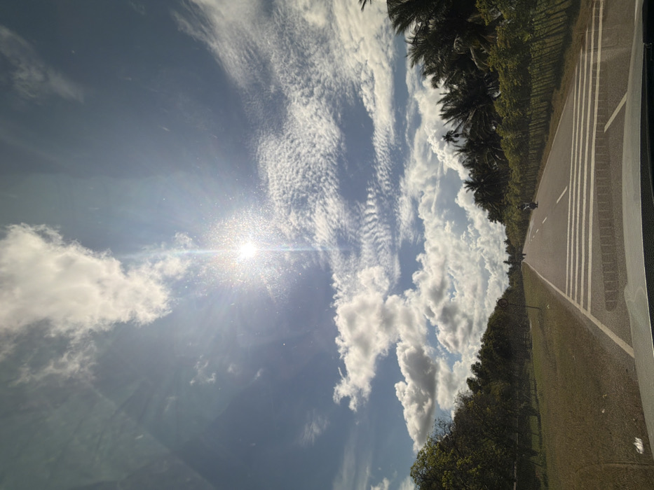 A bright sun shines through a blue sky scattered with clouds. Some clouds are wispy, others are puffy and white. A road runs parallel to a line of trees, stretching into the distance. The perspective is slightly skewed, as if taken from a moving vehicle. The sun's glare creates a dazzling effect.