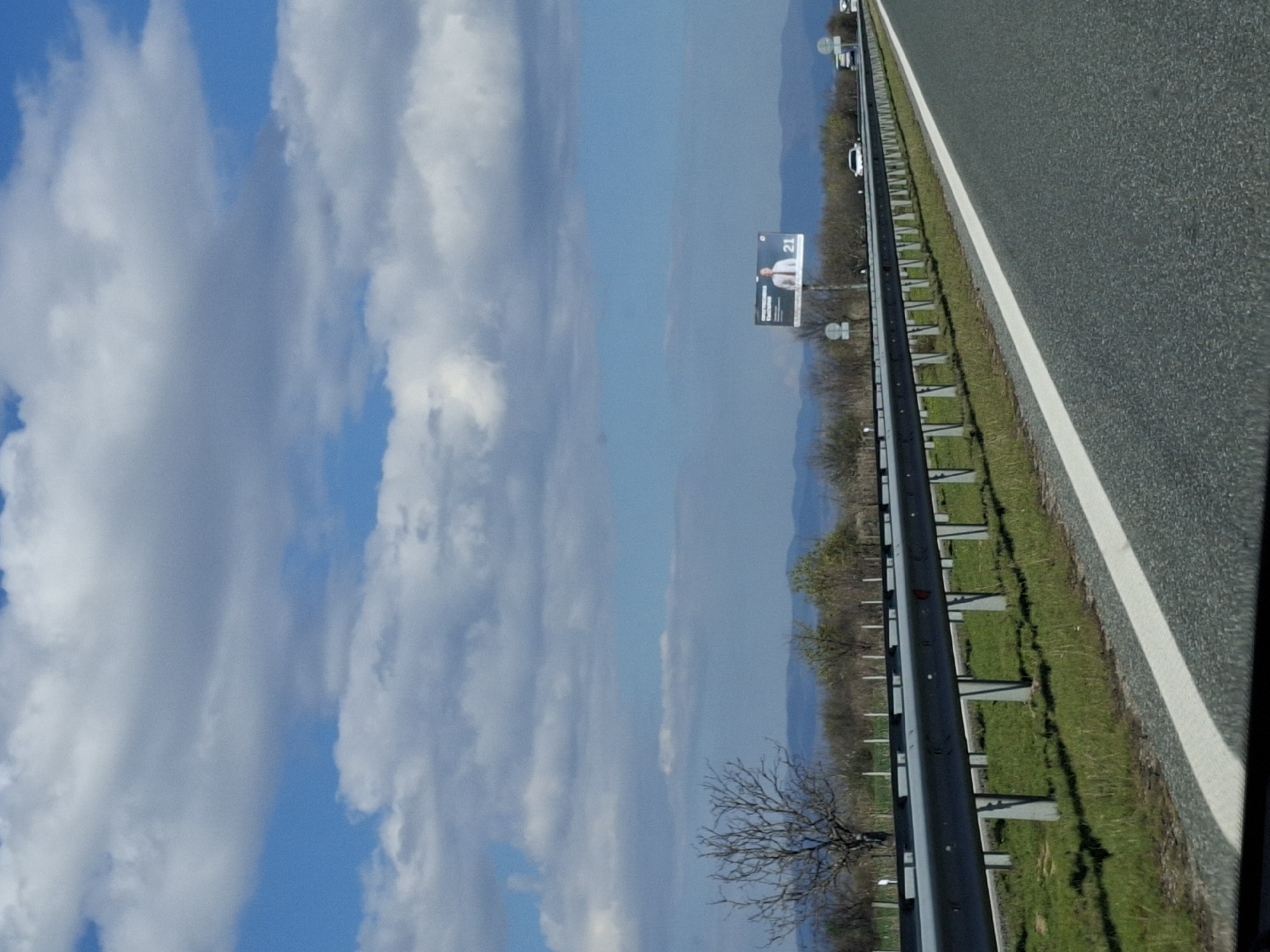 The image captures a view from a vehicle traveling along a highway. The sky is partly cloudy, with a mix of blue sky and large white clouds. The highway is multi-lane, with a concrete barrier separating the lanes. Grass grows along the side of the highway. A billboard is visible beside the road, featuring a man in a suit and the number 21. Mountains are visible in the distance. The image provides limited context to confirm the location as Shtarkovo, Bulgaria.