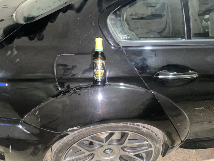 The image displays a close-up, forensic view of the rear passenger side of a black BMW vehicle, likely a sedan, illuminated under artificial light. A brown glass bottle of Guinness Foreign Extra Stout, distinguished by its yellow cap and black label, stands upright on the top edge of the rear fender, positioned directly adjacent to the rectangular fuel filler door. The vehicle's black metallic paint exhibits multiple scratches, scuffs, and streaks of grime or dried liquid, notably around the wheel arch and below the fuel door. The visible wheel is a multi-spoke alloy rim with a BMW logo on the hubcap, and the tire sidewall indicates "SureGrip Pro Sport." A chrome door handle is present on the rear passenger door. The ground beneath the vehicle is an unpaved dirt or gravel surface. No individuals are depicted in the scene. The specific location within Abuja, Nigeria, cannot be determined from the visual evidence.