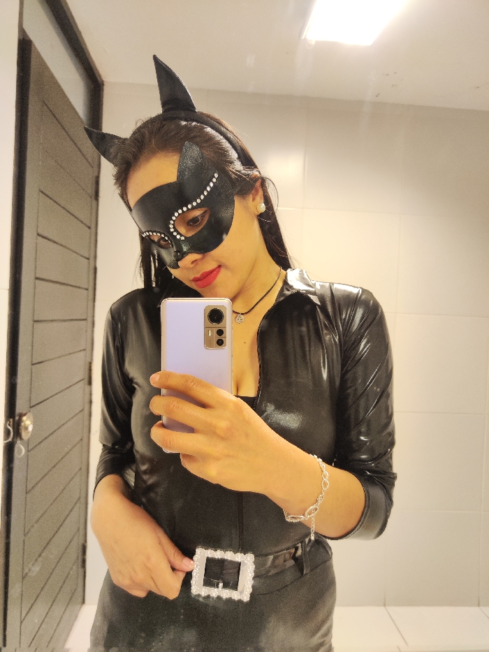 A female subject is depicted in a mirror selfie taken indoors in Wanchaq, Peru. The subject is positioned slightly to the left of the frame, holding a light purple smartphone with a dual-camera module in her right hand, aimed at her reflection. Her left hand is observed near a large, square, silver-colored belt buckle with an ornate border, attached to a black belt worn over her costume. She is attired in a black, shiny, form-fitting costume, likely PVC or latex, with long sleeves and a zippered neckline. The costume includes a black mask adorned with white rhinestones outlining the eye areas and a black headband with pointed cat ears. Her visible right ear features a white pearl stud earring, and she wears a thin black choker necklace with a small, circular, silver-colored pendant. A silver-colored chain bracelet with interlocking oval links is present on her left wrist. The subject has dark hair and wears red lipstick. The background reveals white tiled walls to the right and above the subject, and a dark, horizontally paneled door with a silver-colored doorknob to the left. An overhead rectangular fluorescent light fixture is visible in the upper portion of the frame, casting reflections on the costume and smartphone.