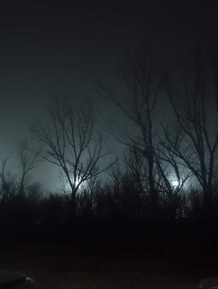 The scene depicts an outdoor night environment in Targovishte, Bulgaria, characterized by dense fog or atmospheric haze. A line of leafless deciduous trees and thick underbrush occupies the middle ground, appearing as dark silhouettes against a hazy, luminous background. Multiple distinct, bright light sources, likely artificial, are obscured behind the tree line, their illumination diffused by the fog to create glowing halos and a general luminosity in the lower sky. The upper sky is dark and uniformly overcast. In the lower-left foreground, the dark, curved surface of a vehicle's upper body is partially visible. No individuals, specific buildings, or active subjects are discernible.