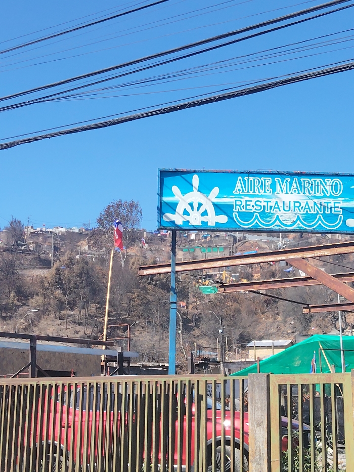 A light blue sign with white text "AIRE MARINO RESTAURANTE" and a ship wheel graphic stands in front of a hillside with sparse vegetation and small buildings. Chilean flags are visible on flagpoles, one prominently. A red vehicle is partially visible behind a metal fence. Overhead, power lines crisscross the clear blue sky. A partial metal structure is visible in the middle ground. The scene has a somewhat distressed or recovering look.