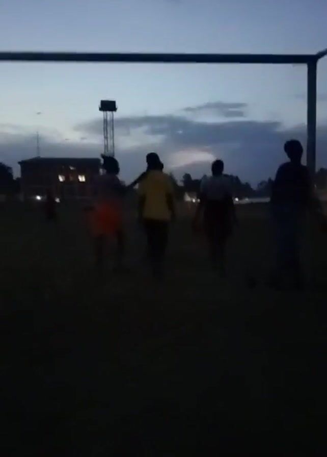 group of people walking on a field during twilight, framed by a football goalpost in the foreground. The scene is quite dark, with the figures appearing as silhouettes against the twilight sky. In the background, there's a building and a tower-like structure. Some lights are visible in the distance. The people are walking away from the camera.