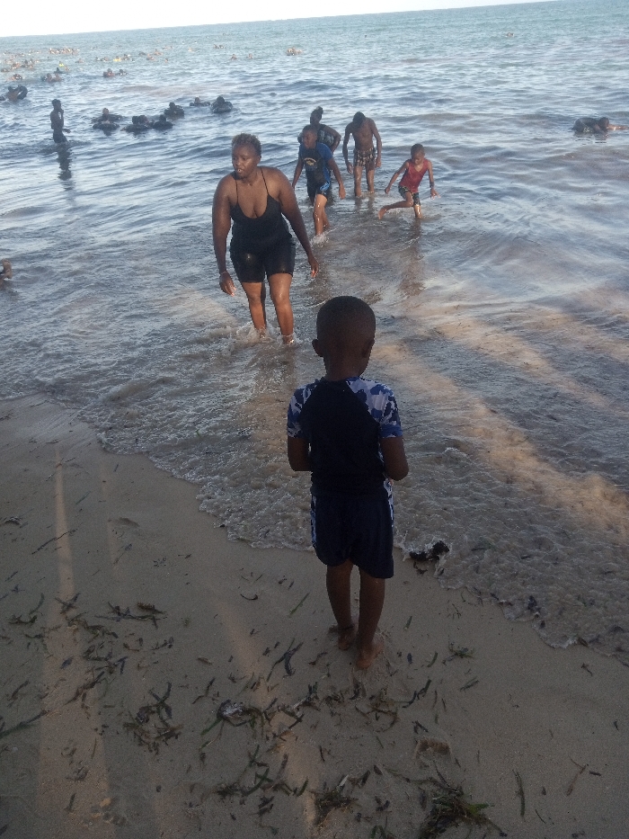 An outdoor scene depicts a coastal area in Shanzu ward, Kenya. In the foreground, a young barefoot male child, approximately 3-5 years old, stands on a sandy beach with his back to the viewer, facing the ocean. He is dressed in a dark blue short-sleeved rash guard with white camouflage patterns on the sleeves and shoulders, and dark blue swim shorts. The light-colored sand directly in front of him and to his left is covered with scattered dark organic debris, likely seaweed. Small waves break on the shoreline at his feet. In the midground, a group of five individuals is wading in the shallow ocean water, moving towards the shore. A dark-skinned adult female, appearing to be in her 30s or 40s with short dark hair, is most prominent, walking with water reaching her thighs. She wears a black one-piece swimsuit or dark athletic top and shorts. To her right, a male child, approximately 8-12 years old, dressed in a dark top and shorts, also wades towards the shore. Further right, another male child, approximately 6-10 years old, in a red t-shirt and dark shorts, is actively walking or running through the water, creating splashes. Two other individuals, one adult male and one child, are partially visible further back in the water, behind the prominent female and children. In the background, the open ocean extends to the horizon under a clear sky. Numerous dark, indistinct figures, consistent with people, are visible in the distant water, mostly submerged or floating, indicating a larger gathering or activity. The water surface exhibits minor ripples and reflections from the natural daylight, which casts elongated shadows from the left onto the sand.