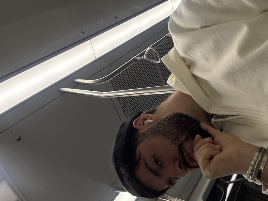A male individual is depicted in a close-up, angled shot within the interior of a public transport vehicle, consistent with a metro or train, located in Segrate, Italy. The subject, possessing dark hair, a full beard, and a mustache, wears a black knit beanie and a light-colored, possibly cream or off-white, hooded zippered sweatshirt. A white wireless earbud is present in his right ear. His right hand is raised, with fingers slightly curled, supporting his chin. Multiple bracelets, including a metal bangle and beaded varieties, adorn his left wrist. His gaze is directed towards the camera with a neutral expression. The vehicle interior features a light-toned ceiling with integrated linear lighting fixtures and two curved metal handrails, one with a hanging grab handle. A perforated panel is visible in the background, to the right of the subject.