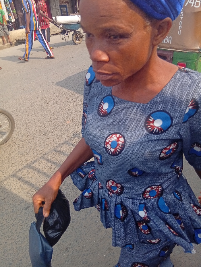 An African woman wearing a blue dress with a round, abstract pattern walks along a street. She has a blue head wrap. In her hand, she carries a small blue bag with a black plastic bag inside. Behind her, people stroll in the background. One person pushes a wheelbarrow. A three-wheeled vehicle is partially visible on the right. The street appears to be paved, and the lighting suggests it is daytime.