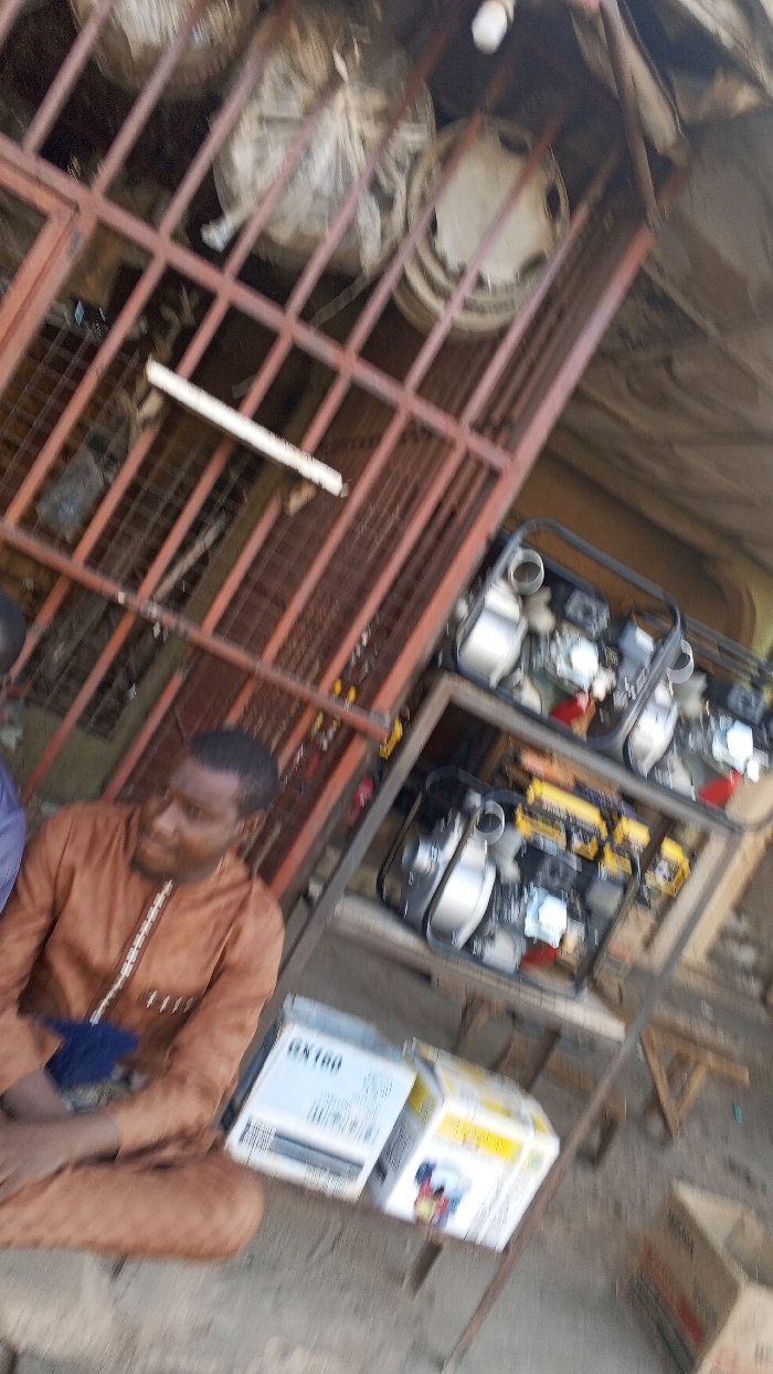 This image, captured in Pantame, Nigeria, depicts an outdoor commercial setting, likely a market stall, specializing in mechanical equipment
