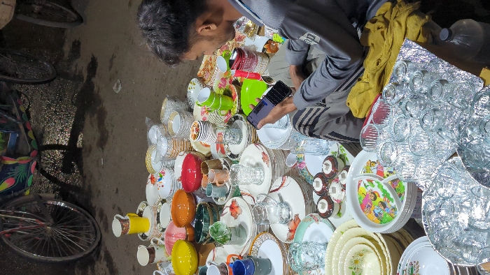 A vendor uses a cell phone to take a picture of displayed tableware, including plates, bowls, cups, and glassware. Items are stacked, showing a variety of colors and patterns. Some glassware is covered in foil. A bicycle stands nearby, with a wet ground surface in the background.