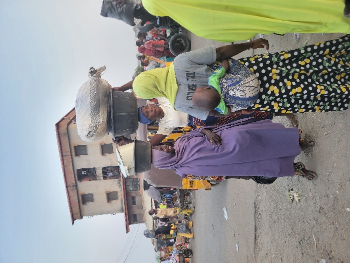 A woman carries a load atop her head next to a building and yellow tricycle. Another woman in a lavender dress and headscarf walks nearby. Further along the street, blurred figures and vehicles fill the scene. A person with a yellow garment stands adjacent to a woman with a baby strapped to her chest. The baby's head is visible. The surrounding area appears to be a busy outdoor market.