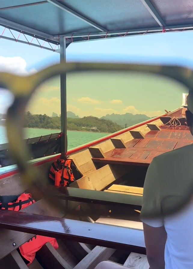 view from inside a longtail boat cruising on a lake under a sunny sky. The camera initially focuses through a pair of sunglasses, providing a tinted and slightly blurred perspective of the scene. It then adjusts to reveal the boat's interior, with wooden benches and orange life jackets visible. A man wearing a white t-shirt and a baseball cap turns towards the camera and waves with a friendly smile. In the background, the lake stretches out with an island and a dam in the distance. The boat has a canopy providing shade.