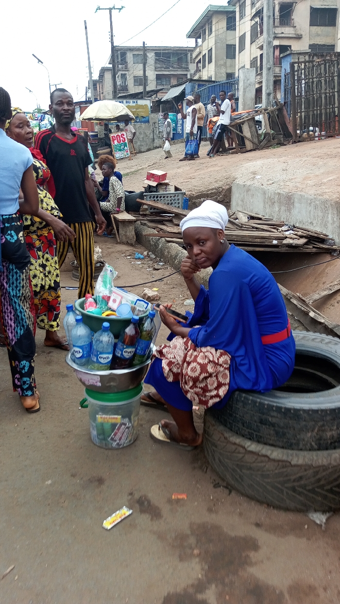 The image portrays an outdoor commercial scene in Ogbunike, Nigeria, under an overcast sky