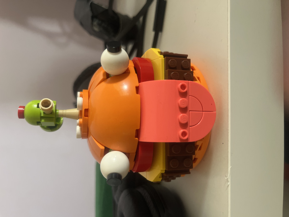 A LEGO burger creation is presented on its side. The burger features orange bun halves with two white eyeball details. Inside, layers of red, yellow, and brown bricks represent toppings. A pink LEGO piece acts as the tongue. A green appendage with a red tip extends from the left side of the burger. The background includes blurry black and white objects and a white wall.
