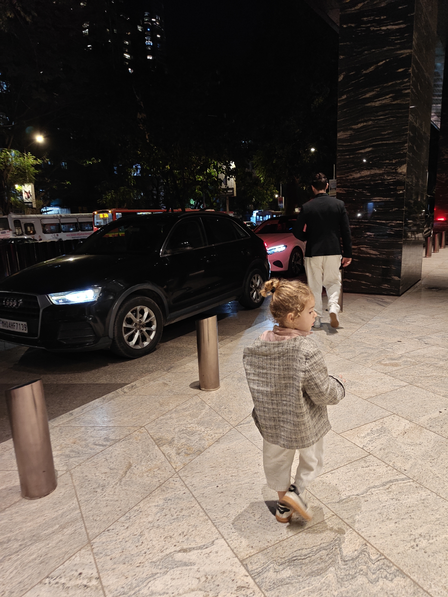 This nighttime image depicts an urban street scene in Mumbai, India, identifiable by the "MH04HF7139" license plate on a parked vehicle, indicating Maharashtra state. In the foreground, a young individual with light-colored curly hair, styled in a bun, is observed walking away from the camera towards the right. This individual wears a grey and white checkered jacket over light-colored pants and multi-toned athletic shoes. The ground consists of light-colored, patterned tiled pavement, which extends throughout the pedestrian area. Two cylindrical metallic bollards, appearing copper-toned, are situated on this pavement; one is in the immediate foreground to the left, and another is positioned further back, centrally. In the mid-ground, an adult male, viewed from behind, walks in a similar direction away from the camera. He is dressed in a dark jacket, light-colored trousers, and light-colored shoes. To the adult's right, a large building facade featuring dark, polished stone columns with prominent lighter veining is present, illuminated by ambient light. To the left of the scene, a black Audi Q3 SUV is parked or idling with its headlights illuminated. Behind and to the right of the Audi, a light-pink sedan is partially visible, also with its headlights on. The background shows further street activity, including at least two buses (one red, one white/light-colored), streetlights, and the illuminated windows of several distant high-rise buildings against a dark sky, partially obscured by dark tree foliage. No direct interaction between the human subjects is discernible.