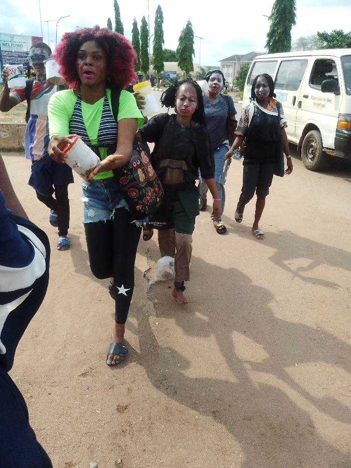 The image displays a daytime outdoor scene in Owerri, Nigeria, featuring a group of at least six individuals walking along the unpaved shoulder of a road. In the foreground, a woman with reddish-brown curly hair is prominent, wearing a neon green top over a black and white striped bralette, torn blue denim shorts over black leggings with a white star on the left calf. She holds a cylindrical white container with a red lid in her right hand, extending it forward, and carries a dark shoulder bag with a floral pattern. Her face has white or light-colored substance applied to her cheeks and forehead. Behind her, to the left, another individual with dark skin, wearing glasses and a striped top, carries a similar white container and exhibits facial markings. To the right and slightly behind the central figure, a woman wearing a black top and two-toned trousers (brown and dark green) is barefoot; her face also displays white markings. Further back, two more women are visible, both with white facial markings, one in a dark top and jeans, the other in a patterned top and dark trousers, both wearing sandals. The individuals are moving from left to right across the frame. In the background, a white commercial passenger van, resembling a Toyota Hiace, is parked or slowly moving on the paved road, with "COMMUNITY BANK" and "KINGELAN" visible on its side. Tall, slender trees, utility poles, and several buildings, including one with a partially visible "NELFUND" sign, are discernible in the distance. The ground is a light brown, unpaved surface, with visible shadows cast by the subjects, indicating direct sunlight. A white plastic bag is visible as litter on the ground near the feet of one individual.