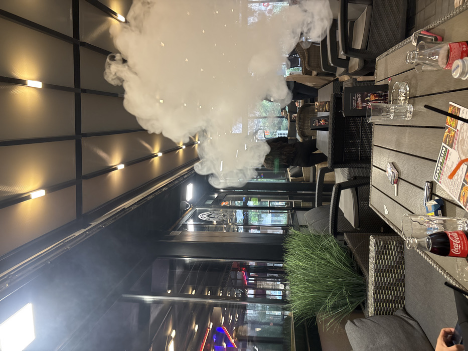 The image depicts an indoor-outdoor seating area of Cofein, a cafe located in Plovdiv, Bulgaria. In the foreground, two dark, slatted tables are visible. The left table holds a brown glass Coca-Cola bottle, an empty glass, a white and red cigarette pack, a blue and yellow lighter, and an open menu displaying "COFEIN." The arm and hand of an individual are partially visible in the lower-left corner. The right table contains an empty glass, an ashtray with a cigarette butt, a red bottle, and a pink smartphone. Seating arrangements consist of wicker-style chairs and sofas with grey cushions, complemented by a large planter of tall green artificial grass. A significant, dense cloud of white smoke, consistent with hookah or shisha, dominates the right and central portions of the mid-ground, partially obscuring a person with long dark hair, dressed in dark clothing, standing with their back to the camera. Another individual is dimly perceptible further back on the right. The cafe features extensive glass windows reflecting interior lighting and offering glimpses of an urban exterior. The ceiling is structured with dark beams and equipped with numerous rectangular flush-mounted lights.