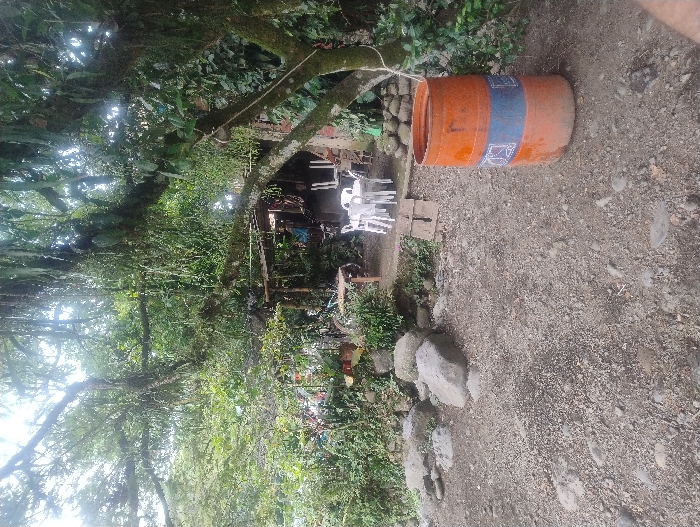 The image displays an outdoor, heavily vegetated area, possibly a leisure or dining space, located in the city of Unknown, Unknown. The foreground consists of a ground covered in light-colored gravel and dirt, with several large, irregularly shaped grey rocks positioned on the left. An upright orange plastic barrel, marked with a blue horizontal band containing white symbols, stands on the right. In the midground, a white plastic table with at least four matching white plastic chairs is arranged on a slightly elevated area. Behind this seating, a rustic wooden-framed structure is partially visible, encompassed by dense green foliage and smaller plants. The upper portion of the scene is dominated by a dense canopy of large tree branches, extensively covered in moss and numerous hanging epiphytic plants, with glimpses of a bright sky through the leaves. No individuals are present, and no actions or interactions are depicted within the scene.