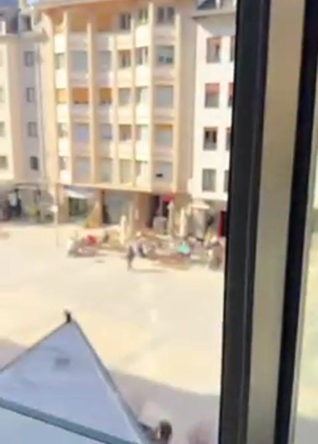 The video begins with a close up of a window frame before opening to reveal an outdoor view. The view is of a square in a town, with buildings surrounding the square. There are people sitting at tables outside a building and walking around. Beyond the buildings, a snow-capped mountain is visible in the distance. Flags are seen on the roof of one of the buildings, which also has the words "Hotel Roc Blanc" on its facade.