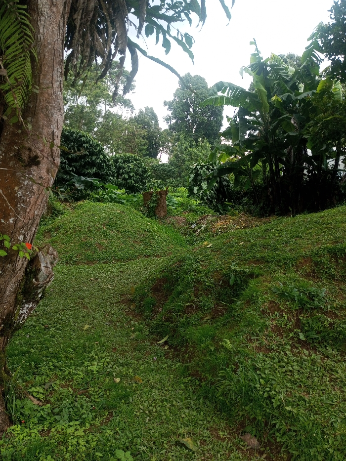 The scene, located in Nghĩa Đồng Commune, Vietnam, depicts a dense, verdant landscape under an overcast sky. A large tree trunk, displaying textured brown bark with patches of moss and a fern frond, occupies the left foreground; a small red flower is visible near its base. The ground cover consists of undulating terrain with small hills and depressions blanketed by short, dense green grass, forming a visible path-like cleared area through the center. A weathered brown tree stump or post is centrally positioned in the mid-ground. Beyond this, rows of dark green, bushy plants, consistent with coffee cultivation, are visible, alongside taller banana trees with broad leaves on the right. The background features a dense, multi-layered forest canopy composed of various tree species. No human presence or specific activities are observed.
