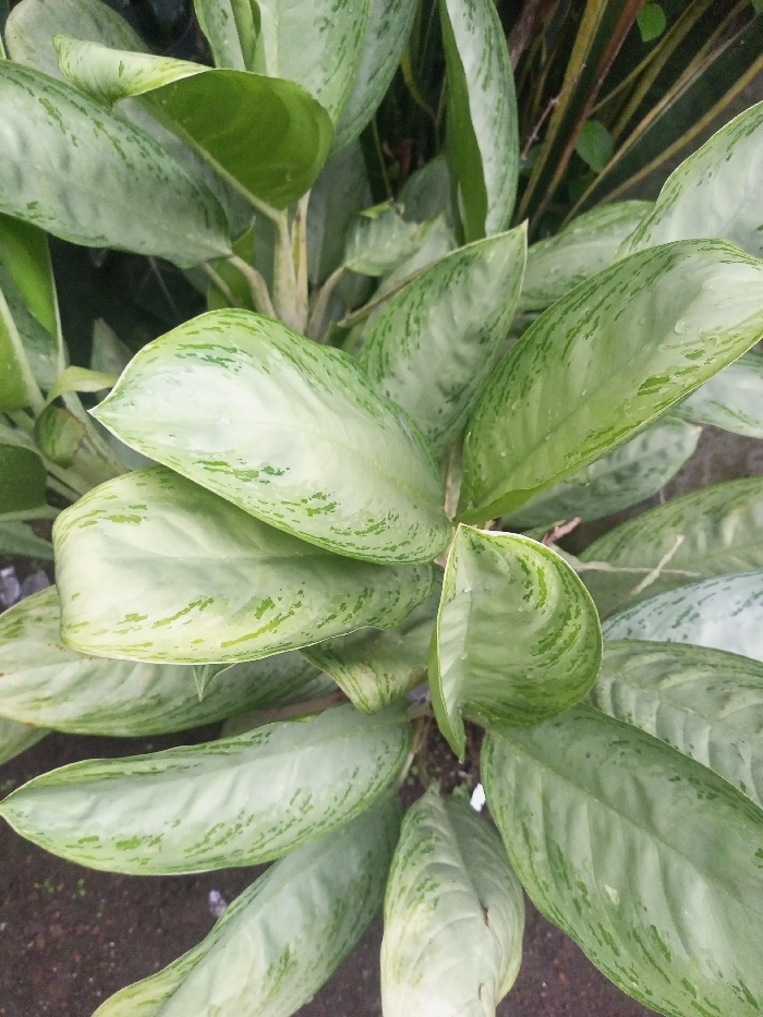 - "The scene depicts an overhead, close-up view of a foliage plant, likely an Aglaonema species, situated outdoors in Bamhori, India" by FM-AHB0B3, licensed under CC BY 4.0