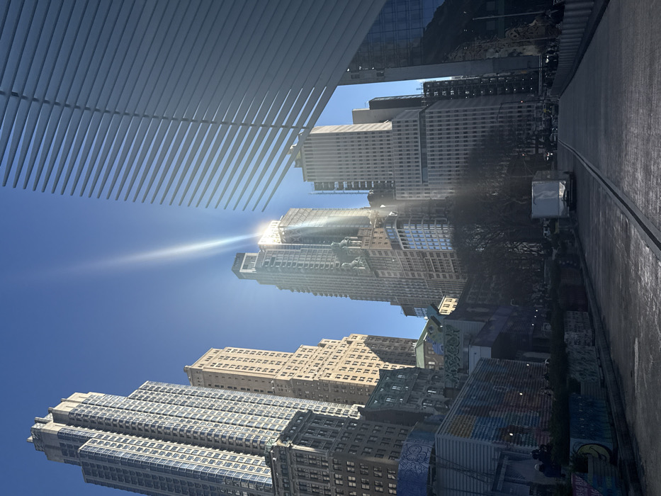 - "view of tall buildings against a clear blue sky, partially obscured by a modern architectural structure with parallel beams at the top left" by FM-ownra2, licensed under CC BY 4.0