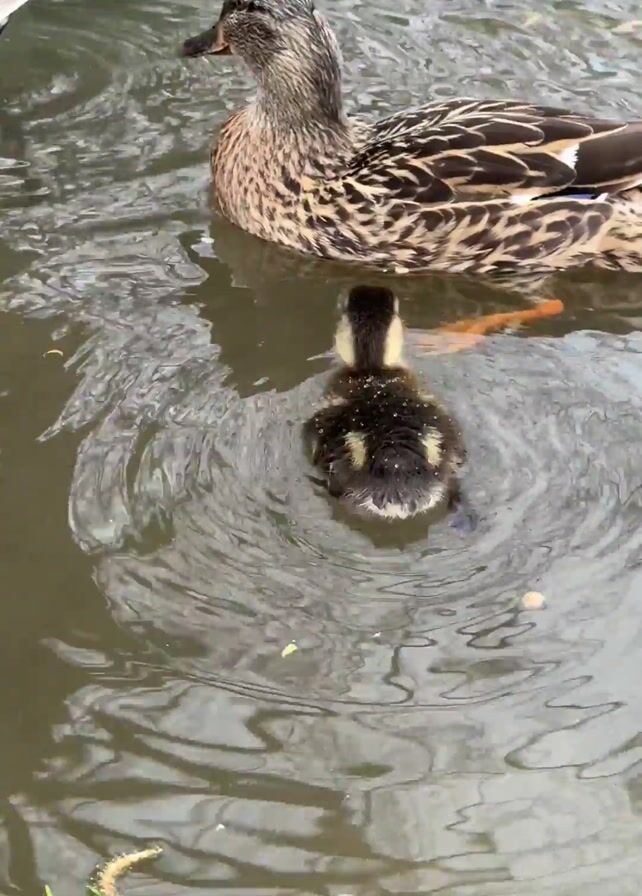 duck and a duckling swimming in a body of water. The mother duck is brown with black patterns and a black bill. The duckling is smaller and dark, with yellow patches. It is seen swimming in a circular motion in the water. The water is murky and reflects the overcast sky. There are some leaves and small plant pieces floating in the water. Other ducks are visible in the background.