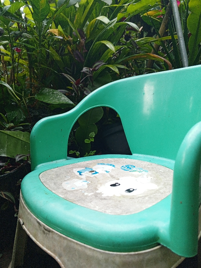 - "The image displays a teal-green plastic child's potty training chair positioned outdoors amidst lush green foliage, in Phoukhoun, Laos" by FM-5qMEH3, licensed under CC BY 4.0