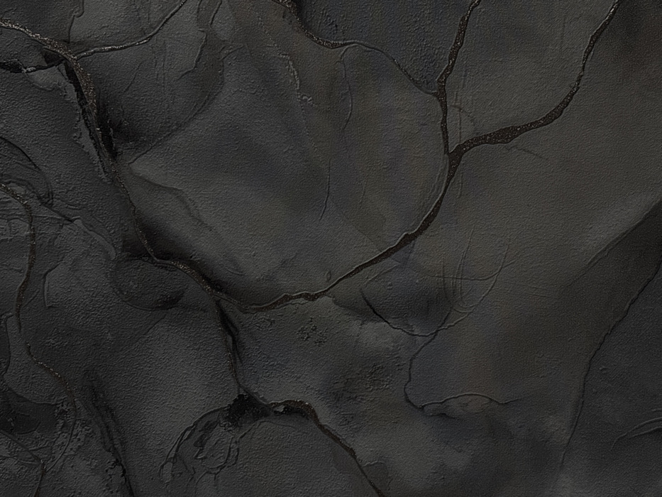 The scene, located in Ольховка, Russia, presents an abstract textured surface. It is composed predominantly of dark grey and black tones, forming organic, fluid patterns suggestive of ink, smoke, or weathered rock. Irregular, curvilinear lines, exhibiting a subtle dark metallic or glittery quality, resembling cracks or veins, traverse the entire composition. The surface texture varies, showing areas of fine grain or slight roughness alongside smoother, more amorphous regions. Subtle variations in shading create an impression of depth and undulation across the abstract forms. No discernible people, subjects, specific objects, actions, or interactions are present within the frame. The environment is depicted through this stylized, dark, and intricate visual texture.