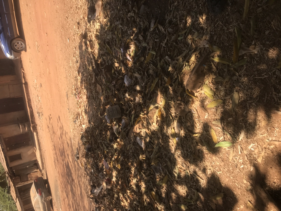 This image depicts a street scene in Hayin Banki, Nigeria, under daylight conditions, characterized by an unpaved, reddish-brown dirt road. In the immediate foreground, a substantial accumulation of dry leaves, small branches, and mixed refuse, including plastic bags and bottles, covers the ground. Dappled sunlight and shadows from an unseen overhead canopy fall across this debris pile and the adjacent ground. The midground features the dusty, reddish-brown dirt road, which appears uneven. Along the far side of the road, several low-rise, weathered buildings are visible. These structures have unpainted facades, consistent with mud or concrete construction, and corrugated metal roofs. A dark-colored sedan is parked on the left side of the road, facing away from the viewer. On the right side, a blue SUV is partially visible, indicating another vehicle in the scene. No individuals are present, and no actions or interactions are depicted.