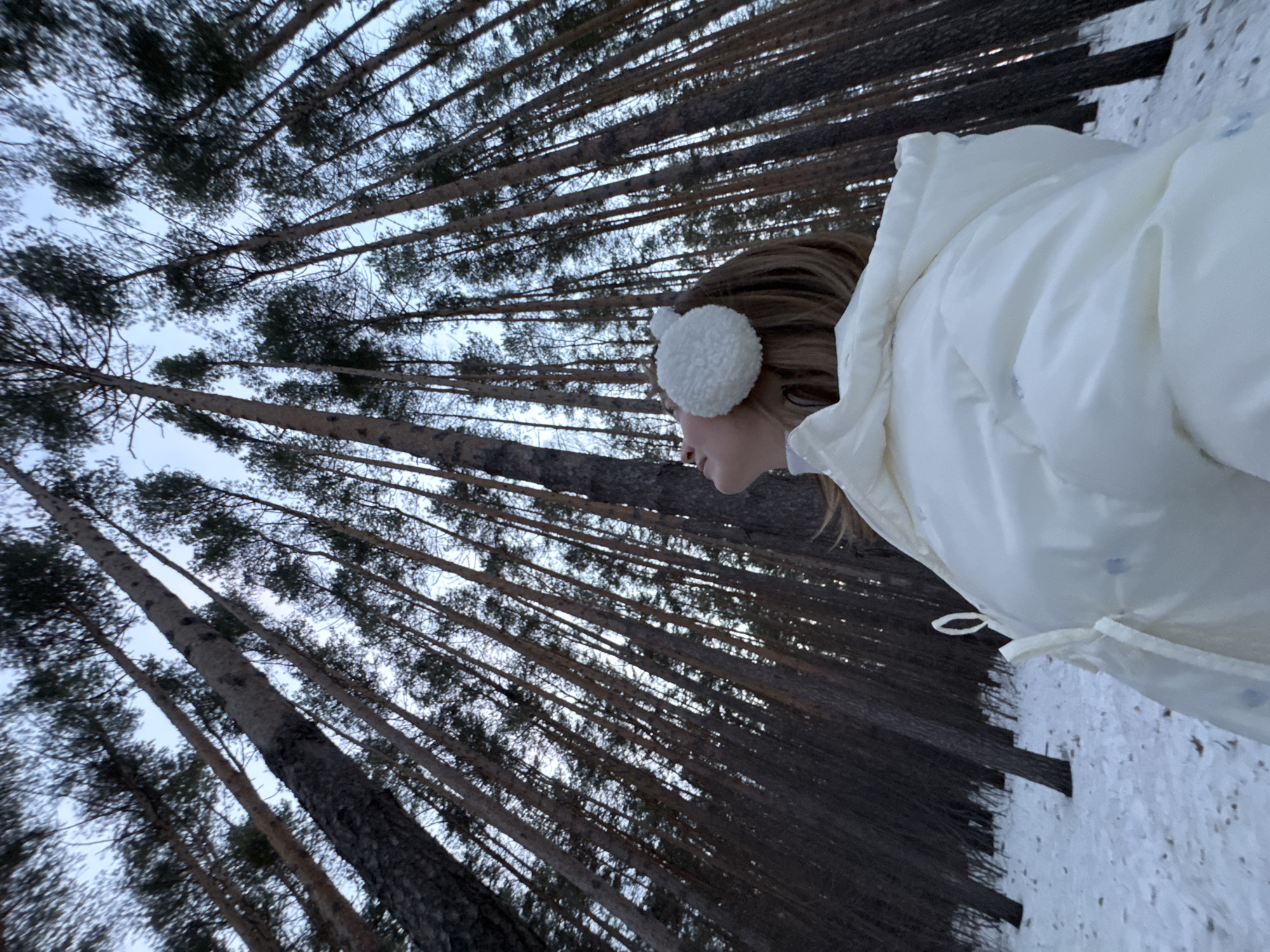 A woman wearing a white puffy jacket and white earmuffs stands in a snowy forest. The trees are tall and thin, reaching high into the sky. The location is Chaikovsky, Russia.