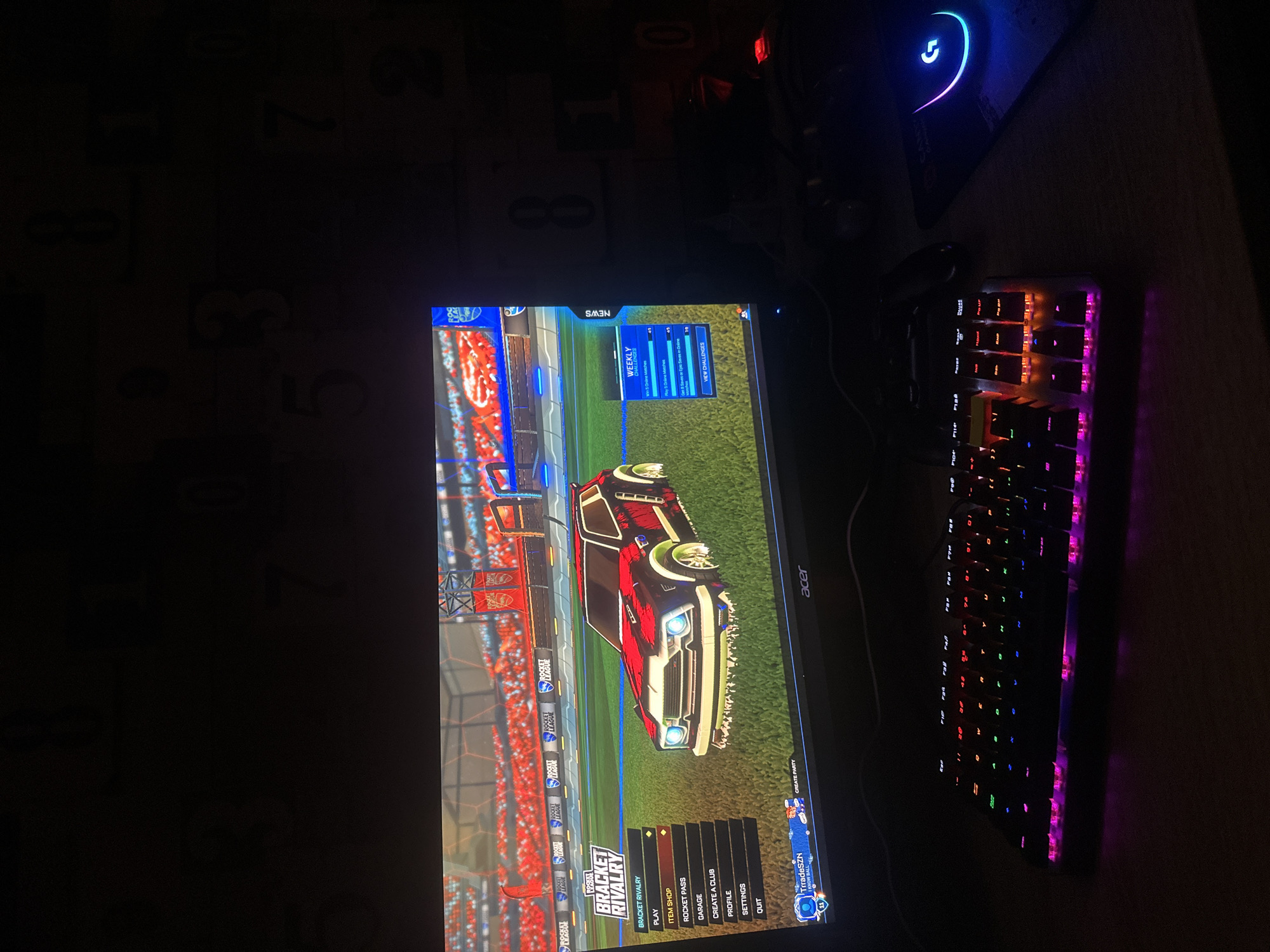 The image depicts a person's desk with a monitor displaying the main menu of the video game "Rocket League