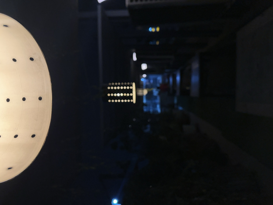 The image depicts a dimly lit indoor or semi-outdoor commercial establishment, consistent with a dining or leisure area, at night. The scene is presented from a low-angle perspective looking down a central aisle. In the immediate foreground, occupying the upper portion of the frame, is a large, circular, off-white overhead light fixture, heavily blurred and out of focus. This fixture features multiple small, dark, circular perforations arranged symmetrically on its surface. The background shows a long, narrow pathway or aisle, dimly illuminated. To the left of this pathway, dark, undefined foliage or planters are present. To the right, dark structures, possibly walls or dividers, are visible. Multiple blurred light sources (bokeh) are scattered throughout the midground and background. A prominent vertical cylindrical light fixture, patterned with rows of illuminated dots, hangs in the midground to the left of the central axis. Further down the pathway, several dark-colored tables and seating arrangements are vaguely discernible on both sides. In the deep background, a single human figure, wearing a red top, is indistinctly visible, appearing to be seated or standing. No specific actions or interactions are clearly discernible due to the low light and blurriness. The ground appears to transition from a lighter surface in the closer foreground to a darker, possibly turf or tiled, pathway. While the prompt specifies the location as Dhaka, Bangladesh, no specific landmarks or architectural details within the image allow for forensic identification of a precise street address or district within the city.