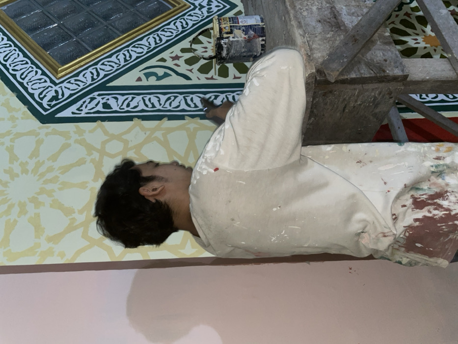 A person in paint-splattered white clothing, presumably a painter, is seen from the side, standing and looking toward the upper left corner of the image