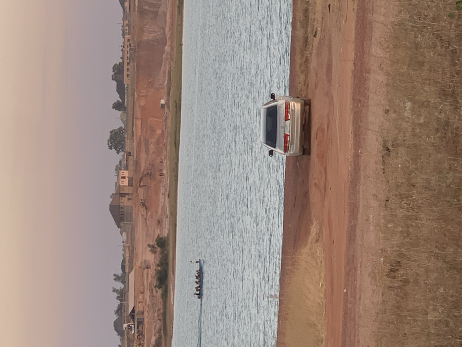 A landscape photograph features a body of water next to a dirt path. A silver car is parked on the path alongside the water. In the distance, buildings are visible near an excavation site with exposed reddish-brown earth. A narrow boat carrying multiple people is on the water. The sky is overcast with a muted tone. Dry, golden grass fills the right side of the frame.