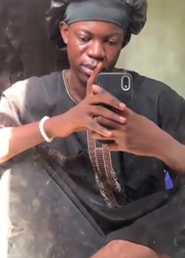 A person wearing a black satin bonnet and a black embroidered tunic is sitting cross-legged on what appears to be a reflective, dusty surface. The person is holding a black smartphone with both hands, looking at the screen as if taking a selfie. They are also wearing a white beaded bracelet on their left wrist. The background consists of a slightly blurred mirror and a wall of varying shades of green. Music is audible in the video.