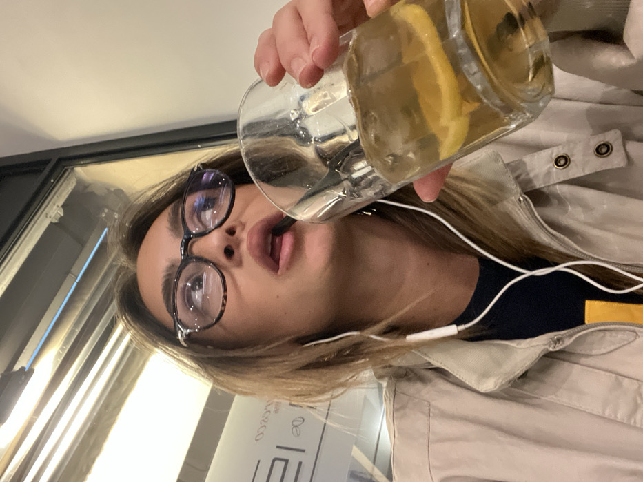 A young adult female is depicted from the mid-chest up, consuming a beverage through a dark straw. She has light brown hair, wears tortoiseshell-patterned prescription glasses, and white wired earbuds. Her mouth is slightly open, engaged with the straw. Her right hand holds a clear glass containing a light amber liquid, ice cubes, and two visible lemon slices. She is dressed in a light beige collared jacket over a dark blue shirt with a yellow stripe. Her gaze is directed upwards and to the right. The setting is an indoor commercial establishment, such as a cafe or bar, within the city of Rome, Italy. The blurred background features reflections on a glass panel, revealing inverted text, "OOCCESORP" (Prosecco), and horizontal fluorescent lighting fixtures. The specific location within Rome is not identifiable from the visual evidence.