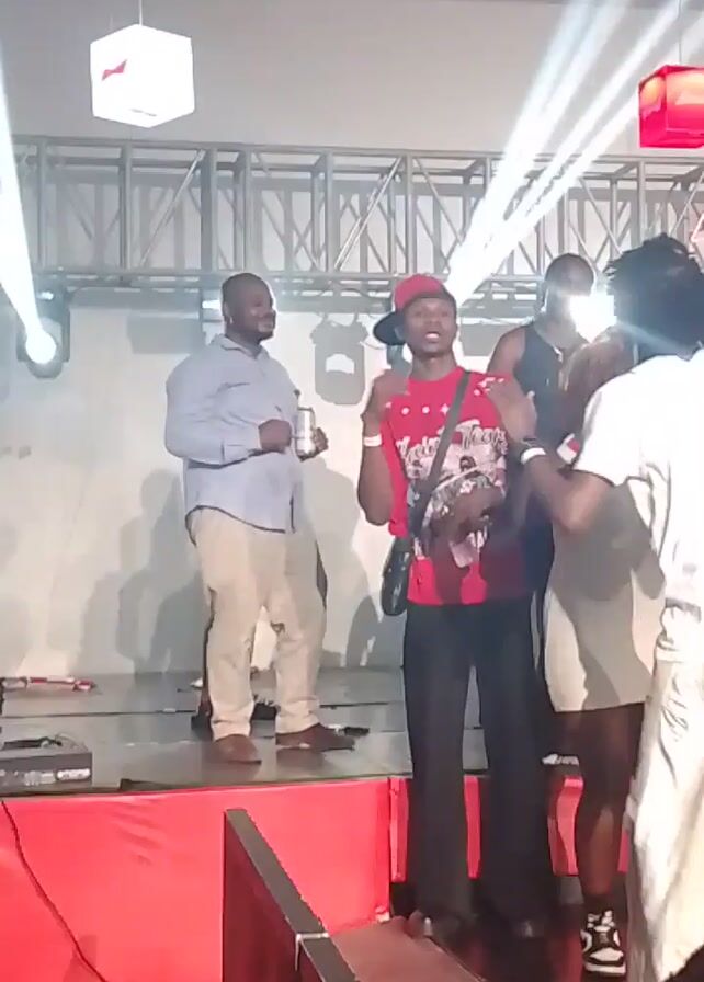 group of people gathered on a stage, possibly at an event or performance. There are bright lights shining from the ceiling. One person in the front is wearing a red baseball cap and a red shirt, while others are dressed in white shirts and casual attire. Some people are raising their arms, seemingly enjoying the music or performance. There's a black table or DJ booth with a screen showing a red logo in the background. The overall setting appears to be an indoor venue, possibly a club or event space.