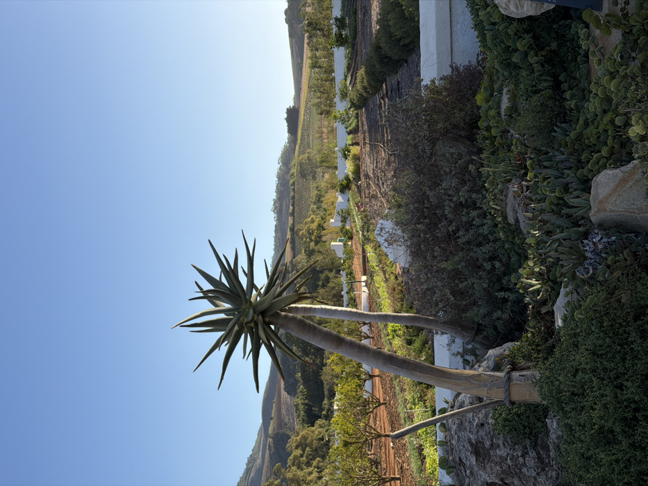 This image depicts an agricultural and natural landscape, consistent with the winelands region near Paarl, Western Cape, South Africa. In the immediate foreground, two tall, pale-trunked *Aloe dichotoma* (Quiver Tree) plants are prominent. The specimen on the left leans slightly, displaying a dense rosette of spiky, green-grey leaves, and its trunk is secured near the base by a visible rope to an auxiliary support. Below these plants, a rock garden features various low-growing succulents, cacti, and shrubs. A white, horizontal retaining wall delineates the transition to the midground. The midground reveals cultivated areas: to the left, an orchard with rows of small, dark-leafed trees planted in reddish soil. To the right, multiple rectangular garden beds are visible, some tilled with dark earth, others containing neatly aligned rows of green crops. In the far midground, a white farm building with a light-colored roof is partially visible amidst trees, alongside a continuous white wall. The background comprises undulating hills covered extensively with vineyards and natural vegetation, receding into the horizon. The sky is clear and bright blue. The lighting indicates either early morning or late afternoon, characterized by warm, soft illumination and moderate shadows. No individuals are present in the scene.